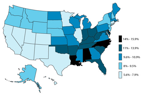 In other words, when children were required to pass a state-mandated test to go to the next grade level, more ADHD was discovered by parents (as the likely culprit for failure). According to Dr. Hinshaw, most of those states were in the South. The states reporting the highest prevalence of ADHD were North Carolina, Louisiana and Alabama (15.6%, 14.2% and 14.3% respectively). And other southern states also showed high prevalences of ADHD as well (see chart).