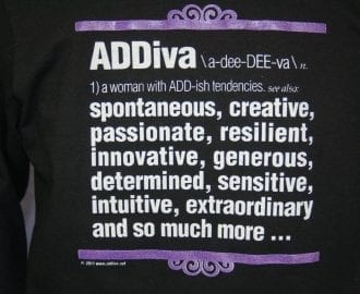 There are many products that carry the signature ADDiva logo: T-shirts, buttons, calendars, mugs and whimsical bumper stickers. Visit Shop ADDiva for lots of choices!
